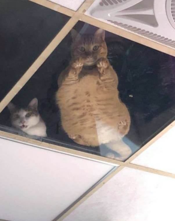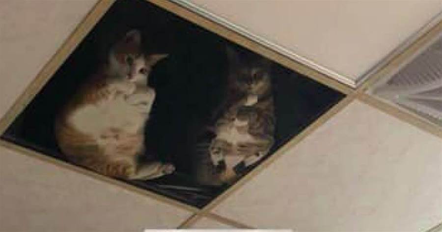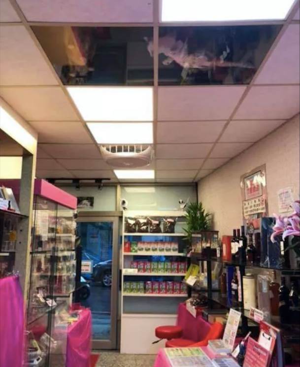 就有這麼一位網友,這一天打算去一家商店裡買些東西。當時店裡也沒什麼人,但是他卻總覺得自己被監視了一樣!當他抬起頭看的時候,就被嚇了一跳!原來在天花板上面,有幾塊是透明的玻璃,而上面有好幾隻貓咪在朝下面看著呢!看它們的注意力全是在自己的身上,這是在監視自己啊!